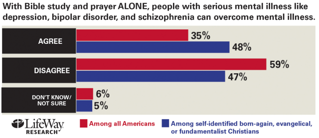 There were other interesting findings from the study (telephone survey of 1,001 adults, conducted from September 6-10, 2013). 48% of Evangelical, fundamentalist or “born again” Christians believe prayer and Bible study alone can overcome serious mental illness depression, bipolar, schizophrenia) compared to 27% of all Americans.