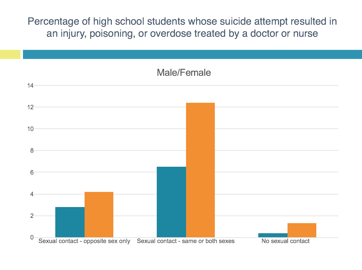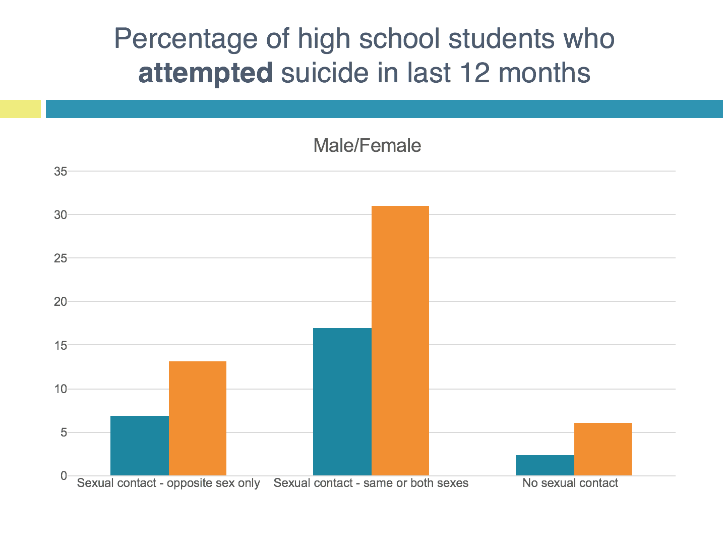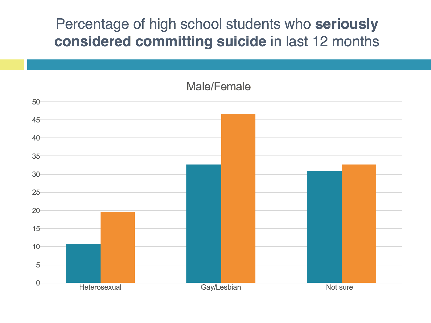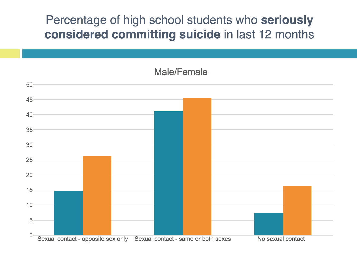 - The statistics describing rates of suicidal ideation among LGBQ teens are especially  alarming and public health interventions targeted at reducing suicidal ideation and behavior among sexual minority youth are clearly indicated.