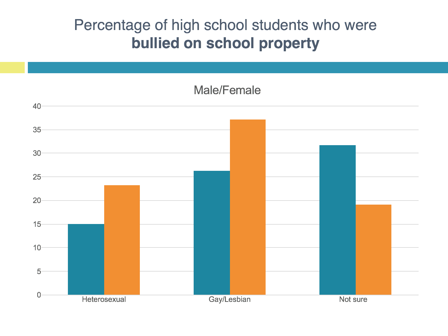 In the sample, 20.2% of all students; 18.8% of heterosexual students; 34.2% of LGB students; and 24.9% of “not sure” students had been bullied at school during the twelve months prior to the survey. Put differently, LGB students are about 80% more likely and “Q” students are about 30% more likely to be bullied compared to “straight” peers.