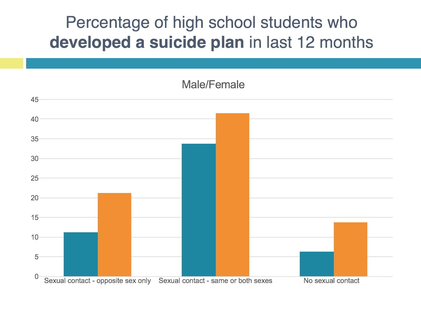 - Overall, students who experienced sexual contact with the same or both sexes are approximately 250% more likely to report having developed a suicide plan than students who had sexual contact with the opposite sex only and 390% more likely to report having developed a suicide plan than students with no sexual contact.