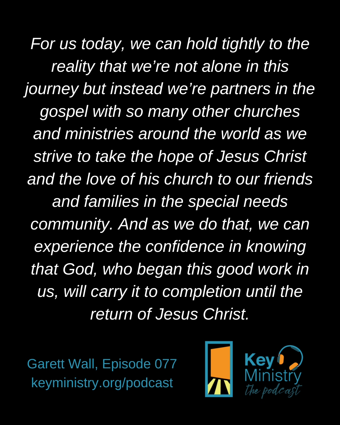 Hey everyone! Welcome to Key Ministry: The Podcast. I’m Garett Wall and I’m your host this week. In today’s conversation, we’ll talk about how God added a new chapter to the message shared in an episode from last month. We’ll also discuss how the apostle Paul’s words of encouragement to the church at Philippi should also be a message of encouragement to all of us who are on this journey to take the hope of Jesus Christ and the love of his church to the special needs community.