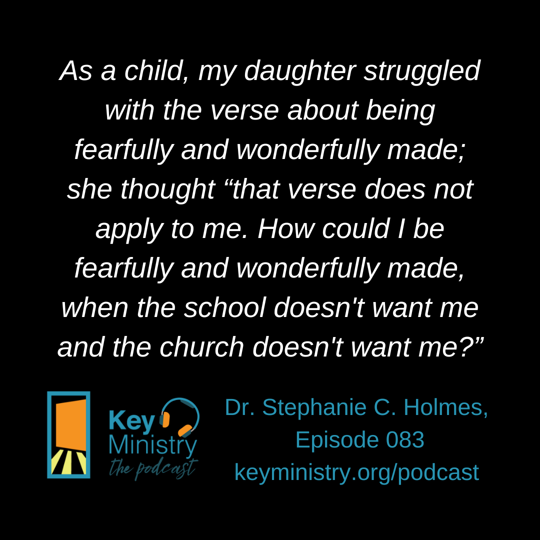 So my daughter would get just a lot of negativity about her behavior: she’s sinful and she’s naughty. And it’s in the book, which we’ll talk about in a minute. But she struggled. And every time I read this, I get tearful—how an 8-9-10 year old can struggle with the verse about being fearfully and wonderfully made, and think that verse does not apply to me. How my church has treated me; how could I be fearfully and wonderfully made, when the school doesn’t want me; the church doesn’t want me. Yes, Mom and Dad say it, yes my grandparents say it, but they have to, because they’re my family, right? But you know the other people in my life don’t seem to see me as fearfully and wonderfully made.