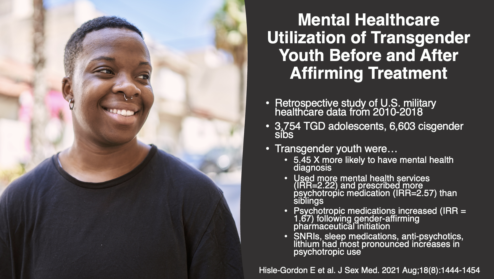 This study reported mental health treatment information for all U.S. Military dependents with a diagnosis of gender dysphoria between 2010 and 2018. Youth who experienced “gender-affirming care” (defined as puberty blockers or cross-sex hormones) were compared to youth with gender dysphoria who didn’t receive puberty blockers or cross-sex hormones, as well as to siblings without gender dysphoria.