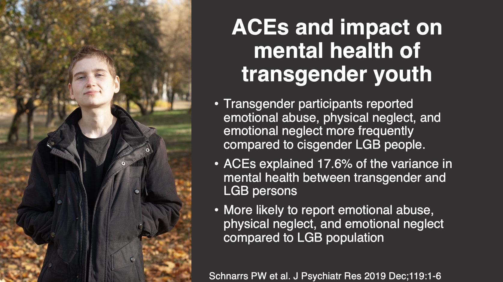 This study looked at differences in mental health symptoms between transgender and LGBQ youth. Across the board, transgender youth reported more emotional abuse, physical neglect and emotional neglect compared to LGBQ youth. Adverse childhood experiences alone accounted for between 15-20 % of the difference in mental health outcomes between transgender and LGBQ youth.