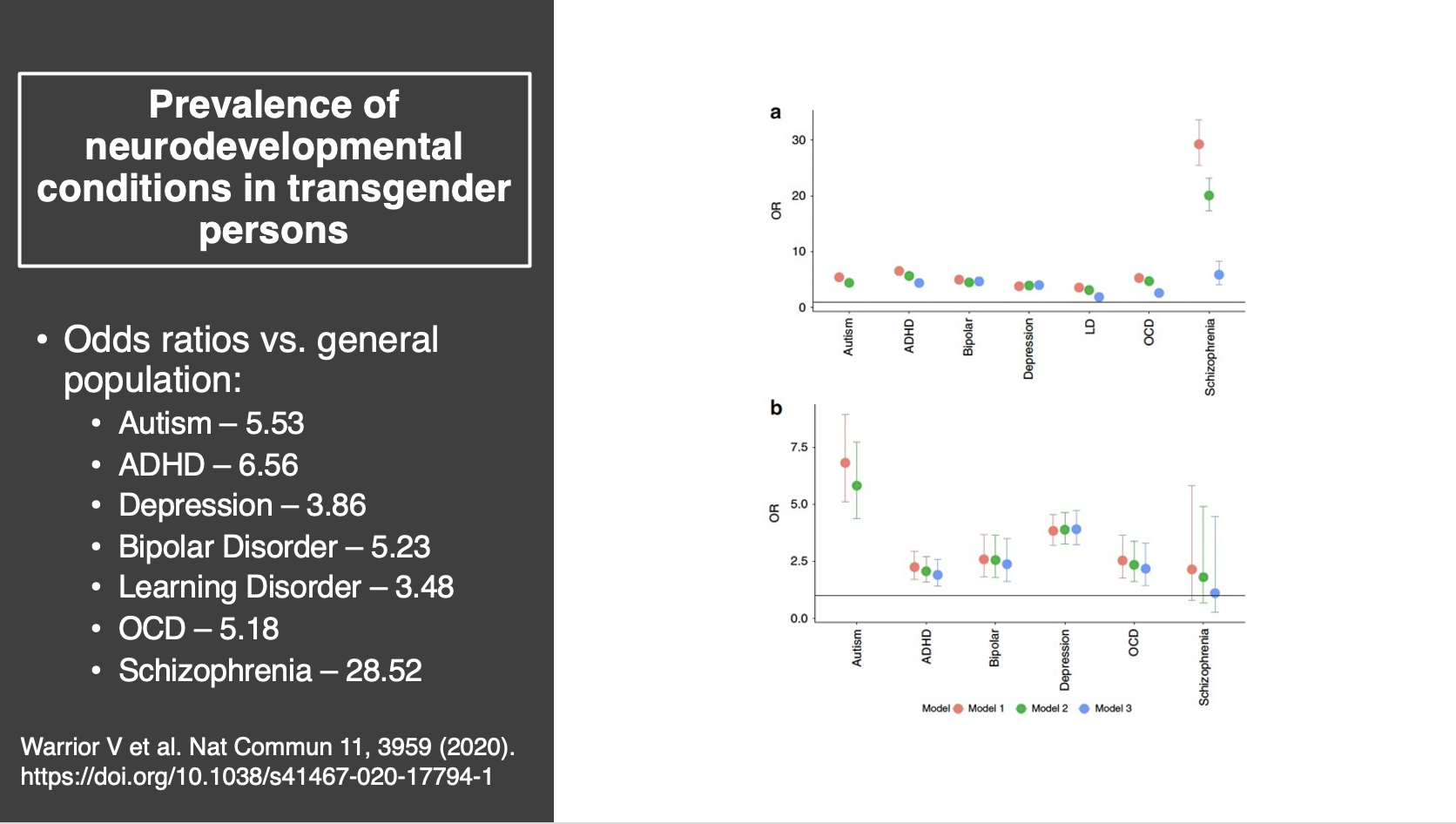 Adults who identify as transgender are more than five times as likely to have received an autism diagnosis compared to the general population. They are six to seven times more likely to have received an ADHD diagnosis, more than five times as likely to have been diagnosed with bipolar disorder, experience elevated rates of learning disorders and OCD and are more than 28 times as likely to have been diagnosed with schizophrenia.