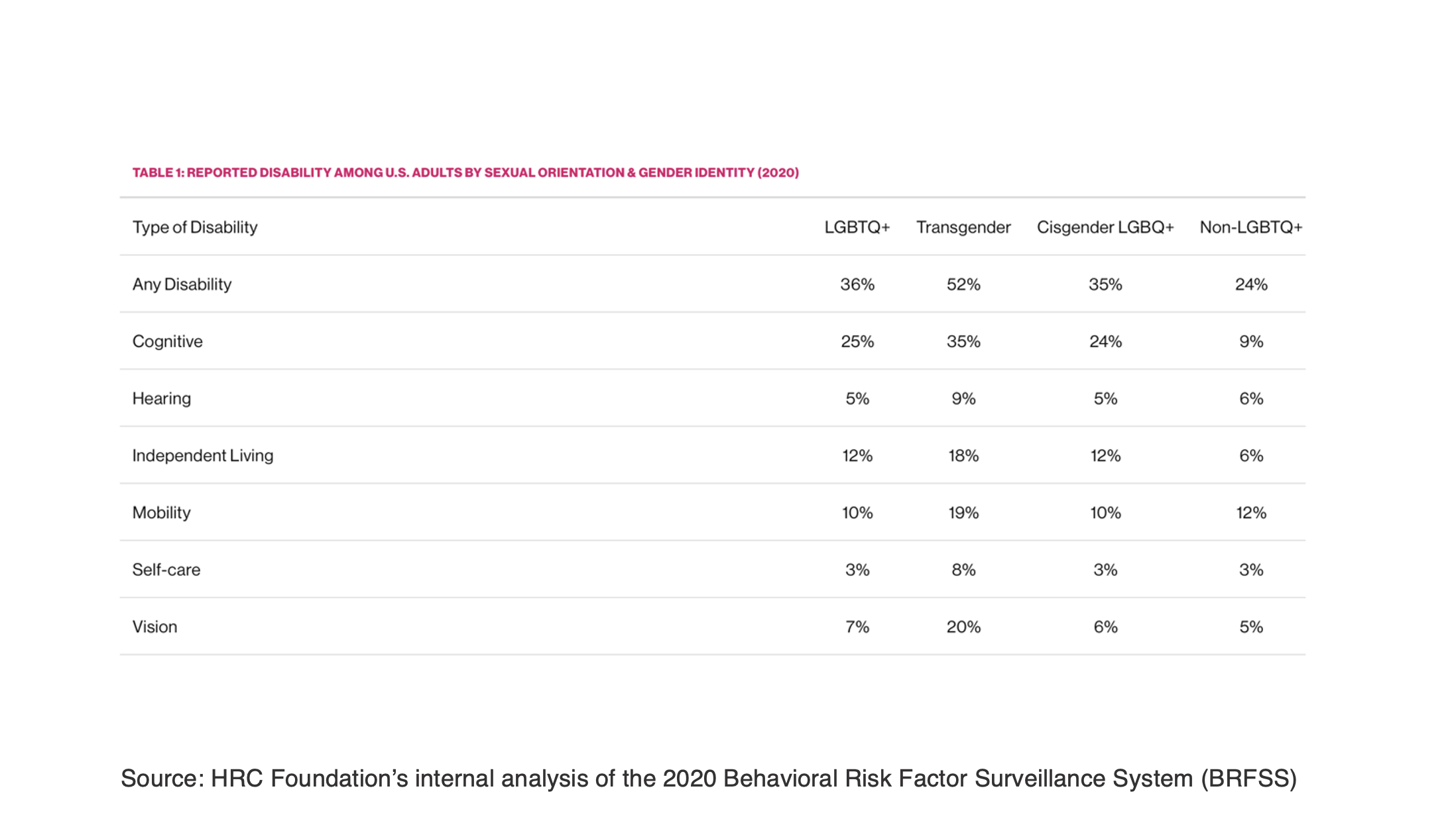 The data I’ll be reviewing, also shared below, is from the Human Rights Campaign, examining the prevalence of common disabilities in the LGBTQ community, as compared with the general population. Adults with transgender identity are more likely to experience every type of disability compared to the LGBQ population, with even larger differences reported versus the non-LGBTQ adult population.