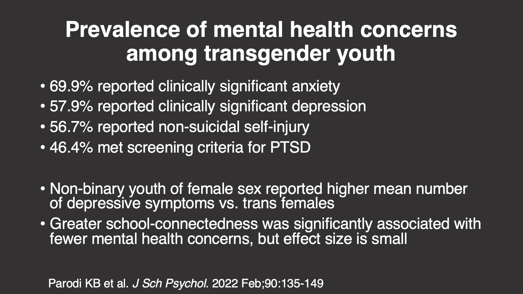 ·Youth with transgender identity had a five-fold greater prevalence of mental health diagnoses compared to their peers.