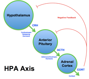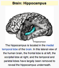 The hypothalamic-pituitary axis (HPA): The HPA plays a critical role in the body’s response to stress. The hypothalamus produces corticotropin-releasing hormone (CRH) which stimulates the pituitary gland to produce adrenocorticotropic hormone (ACTH). ACTH acts on the adrenal gland to increase levels of cortisol (see diagram at top of page). Cortisol is a steroid hormone produced in response to a wide variety of stressors. Cortisol mobilizes energy stores and suppresses immune response. Surgeons prefer to operate early in the morning when cortisol levels tend to be at their highest. Long-term elevation of cortisol levels in children (as seen in kids exposed to high levels of acute or chronic stress/abuse) can turn off the glucocorticoid receptor gene (involved with regulation of the long-term stress response of the brain to cortisol) and the myelin basic protein gene, producing the “insulation” of nerve cells that allows for efficient nerve signal transmission. Elevated cortisol levels also cause damage to the hippocampus (below).