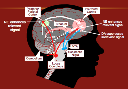 The noradrenergic system (along with the dopaminergic system) is the primary system associated with executive functioning. Tracts of neurons originating in the locus coeruleus project to the posterior attention center in the parietal cortex (responsible for scanning the environment for relevant stimuli) and the anterior fronto-striatal system, which is more involved with executive control and focusing attention. The posterior center is primarily under noradrenergic control, while the anterior center receives both dopaminergic and noradrenergic projections. Difficulties associated with weaknesses in executive functioning include poor impulse control, diminished capacity for emotional self-regulation, delaying gratification and problems with working memory. Editor’s note: This may help to explain the increased prevalence of ADHD among kids who have been traumatized or abused along with the observation they are frequently less responsive to medication than kids with ADHD lacking such exposure.