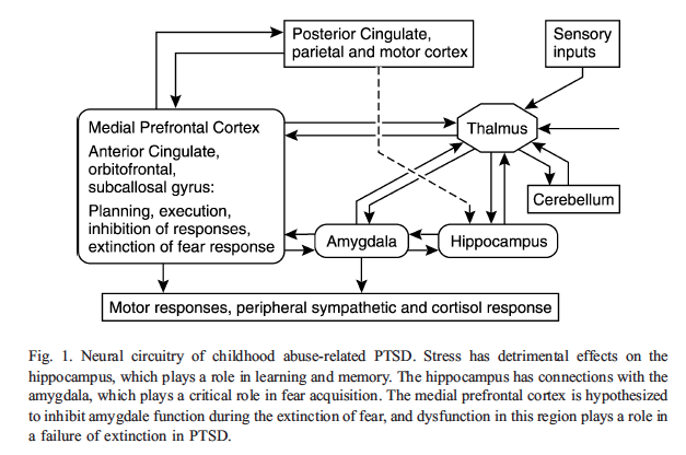Here’s a diagram from an article in Child and Adolescent Psychiatric Clinics of North America that shows the interrelationship of the different neural circuits involved in childhood PTSD…