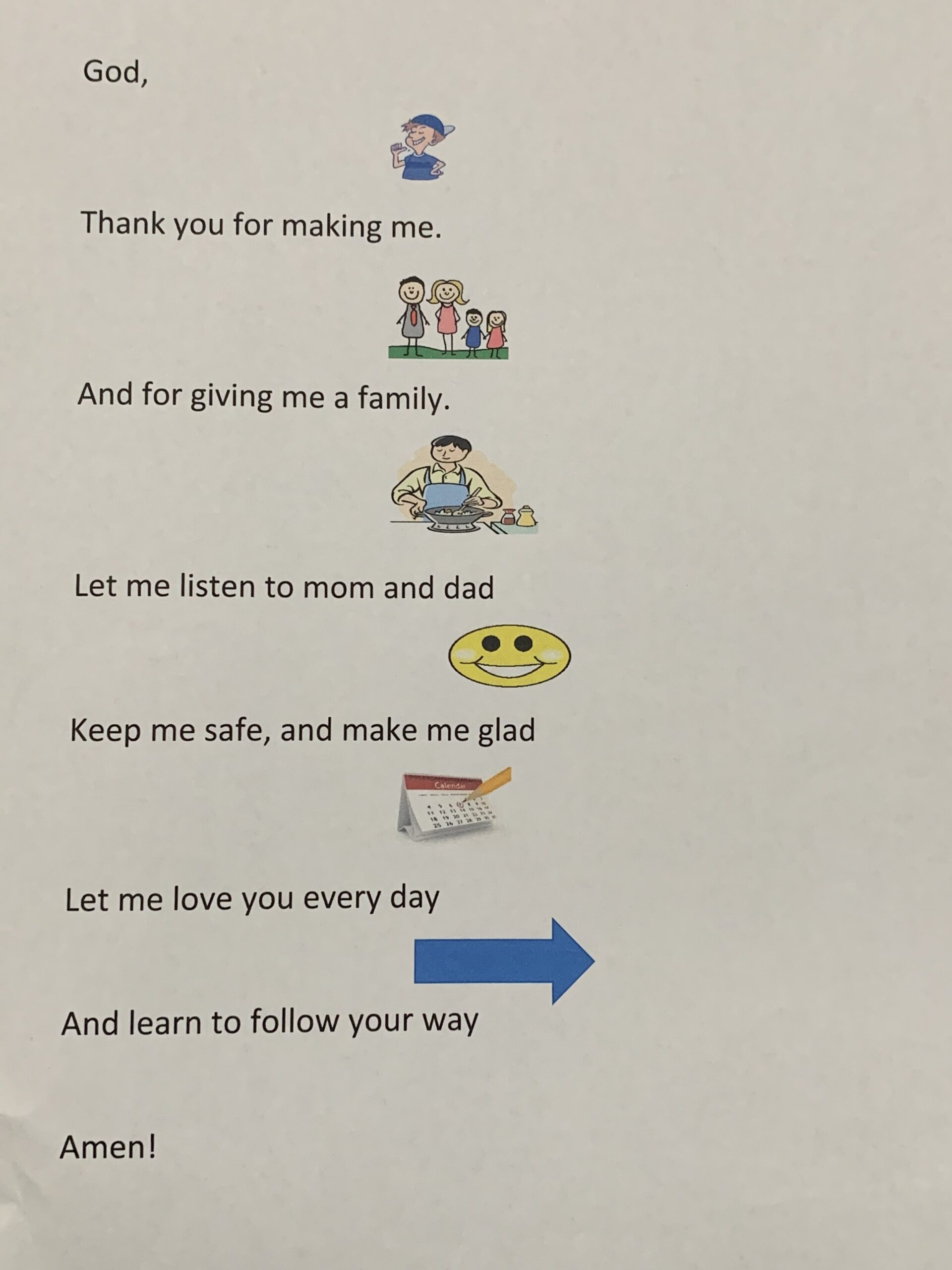 Prayer is such a fundamental part of our faith. Therefore, it is important to encourage development of it for those of all abilities. The ultimate goal of a recited prayer is participation. For some, prayer may come naturally, and they do not necessarily need to participate in a group, recited prayer. For others, this may be extremely helpful for their spiritual growth and inclusion during prayer at church and home.