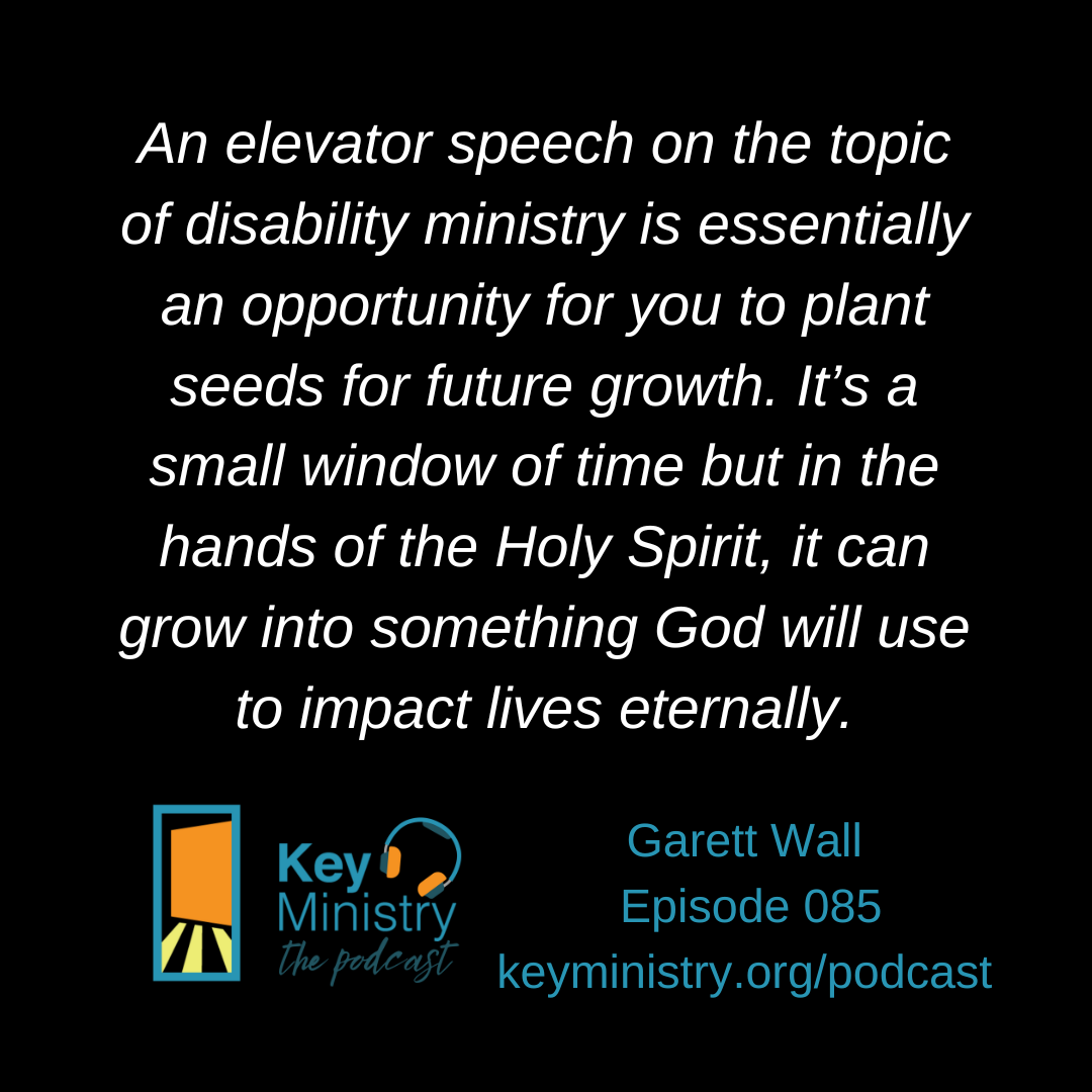I would strongly encourage you to have one or two elevator speeches about disability ministry in your church that you’re ready to share with pastors, ministry staff, volunteers, families, and anyone else God may bring into your path as you seek to cast vision for whatever and wherever God is leading you in the context of disability ministry and the church. Prepare a message of 30 seconds or 60 seconds or 2 minutes to share. This isn’t a conversation where you necessarily get into the weeds of logistics and details of disabilities ministry but instead, it’s a talk centered on vision and impact for the kingdom. Whether the conversation happens in an elevator, a church lobby, a worship center, a parking lot, or the grocery store, the more prepared we can be to share the vision and the impact of disability ministry for the glory of God in our churches, the more likely we are to see fruit. An elevator speech on the topic of disability ministry is essentially an opportunity for you to plant seeds for future growth. It’s a small window of time but in the hands of the Holy Spirit, it can grow into something God will use to impact lives eternally.