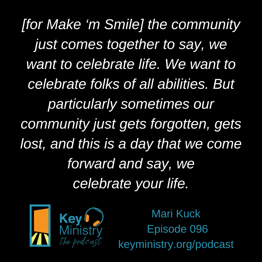 Marie Kuck: I have to mention it’s 80 degrees here and sun-shiny. But anyway, but we’re just thrilled to be able to be kind of bringing these two events together. So Make ‘m Smile started because our son’s birthday, Nathaniel was June 6th, and we could no longer do a birthday party for him. So when his first birthday rolled around, we just said, what could we do kind of in his memory and his honor just to kind of remember him. And we said, well, we can’t really celebrate his life anymore. I mean, he’s up in heaven, he’s celebrating with Jesus, but let’s just celebrate life and let’s celebrate all kids with disabilities. And so our first event began 22 years ago here in downtown Orlando at Lake Eola, and it was a very grassroots attempt to reach out to families and to love on them and just have a great day of blessing and provide resources and fun.
